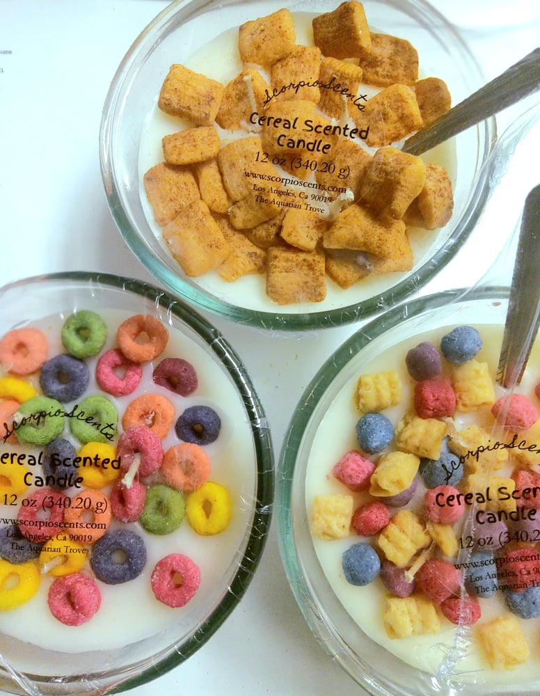 Cereal scented candles who wouldn't love one? Choose your favorite cereal and enjoy. The candle includes a real spoon you remove after lighting. The cereal pieces are all made of wax and each candle smells like its cereal. 12oz and triple wicked for a nice even burn.