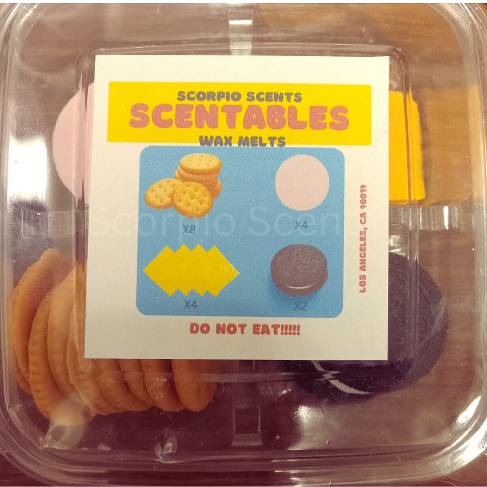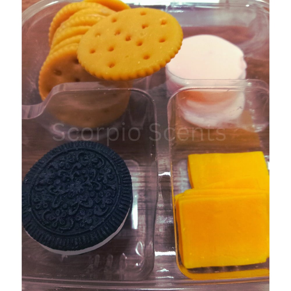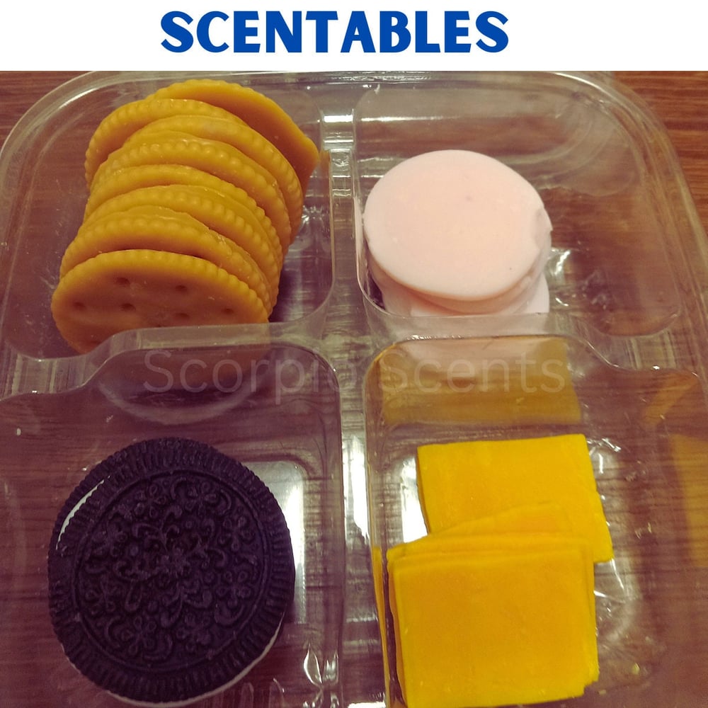 This is a listing for a complete Scentable meal scented in Sugar Cookie. You get 8 crackers, 4 meat slices, 4 cheese slices and 2 cookies!! The contents are enough to make 4 complete cracker,cheese and meat stackers plus you will have the cookies that smell like cookies and cream for later to melt.