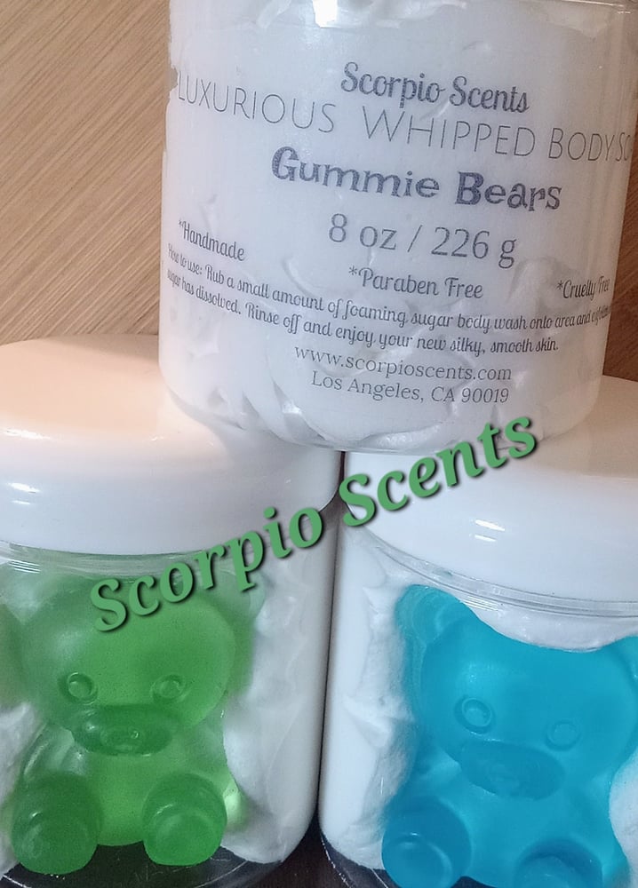 Our Gummie bear whipped sugar scrub is a delightful skincare treat that combines fun and functionality. This whimsical product is made with organic sugar, which acts as a natural exfoliant to remove dead skin cells, leaving your skin feeling smooth and rejuvenated. The "whipped" element refers to the light, fluffy texture achieved by incorporating whipped soap making it easy to spread and massage onto the skin. Infused with the sweet and fruity scent reminiscent of gummy bears, this scrub not only revitalizes your skin but also provides a nostalgic sensory experience. Enriched with nourishing oils, it helps to moisturize the skin, ensuring it feels soft and hydrated post-exfoliation. Perfect for those looking to add a touch of playfulness to their skincare routine, a gummie bear whipped sugar scrub makes the mundane task of exfoliating feel like a sweet indulgence.